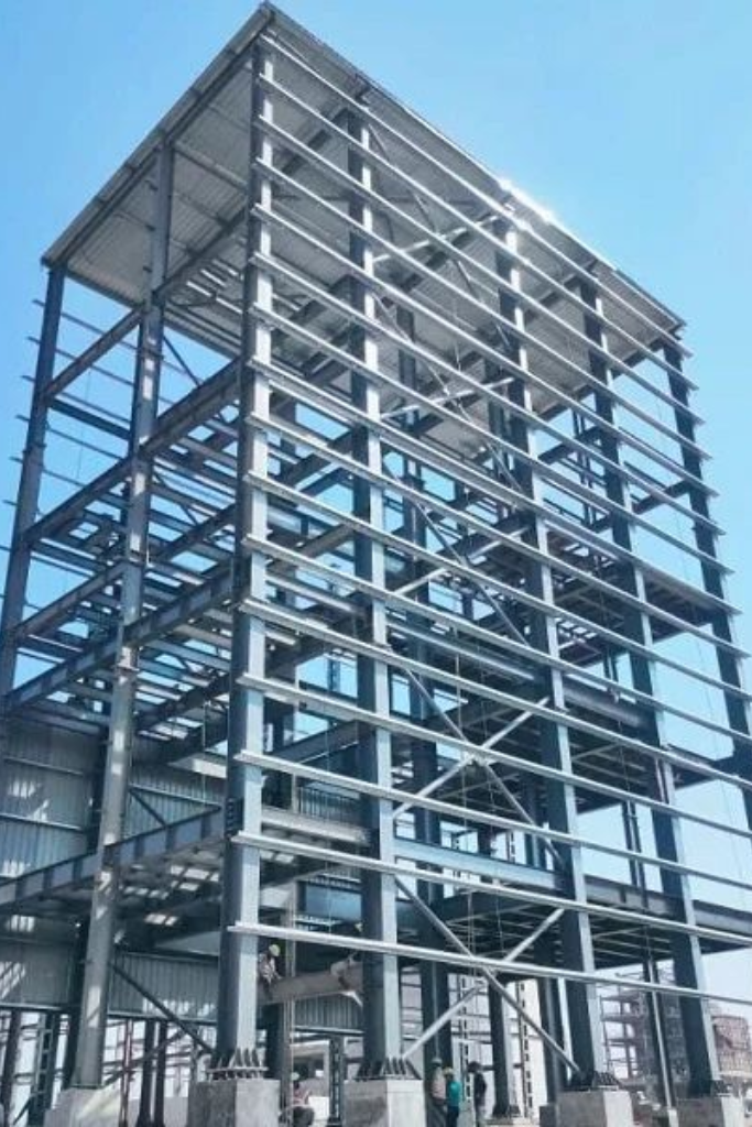 Steel components are cut, welded, and fabricated using advanced machinery, followed by strict quality inspections.